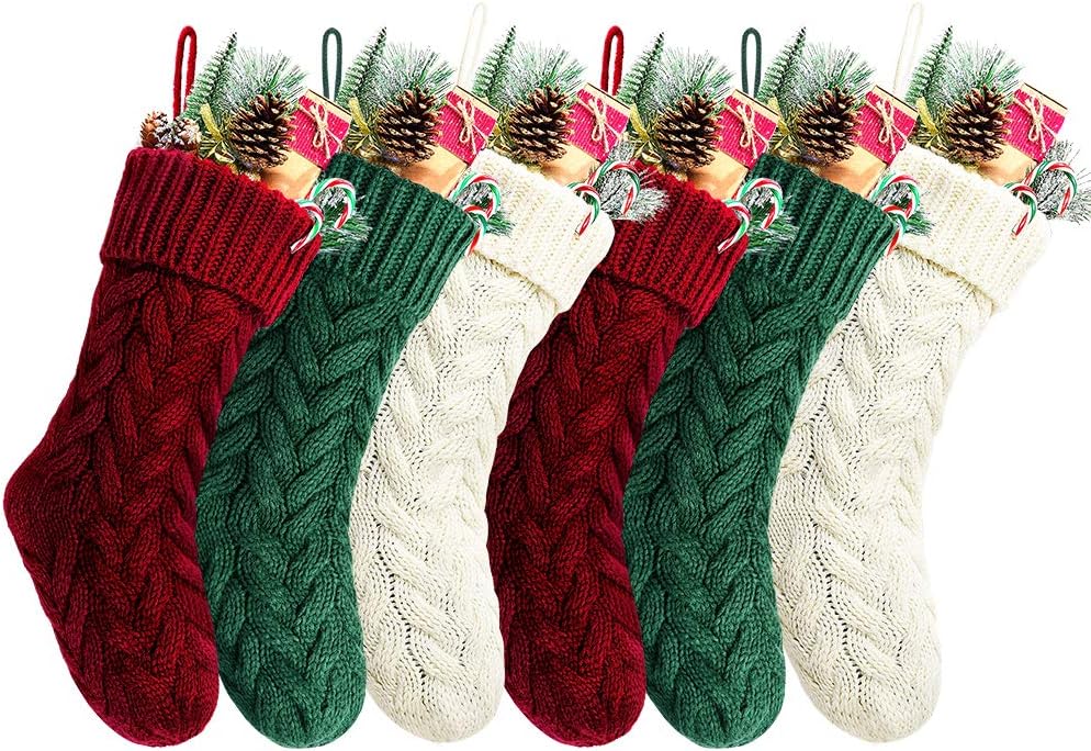6 value rustic knitted Christmas stockings included 2 burgundy, 2 green, 2 ivory knitted Christmas stockings.