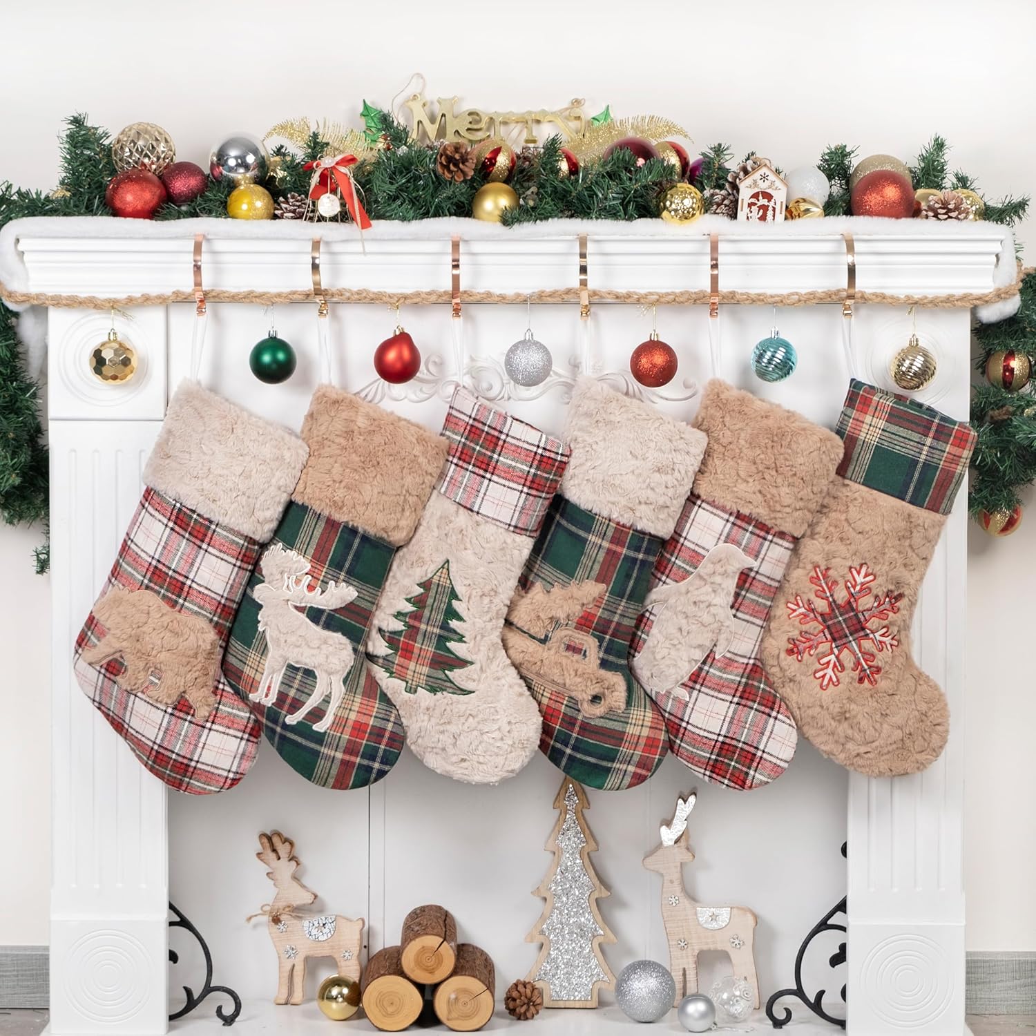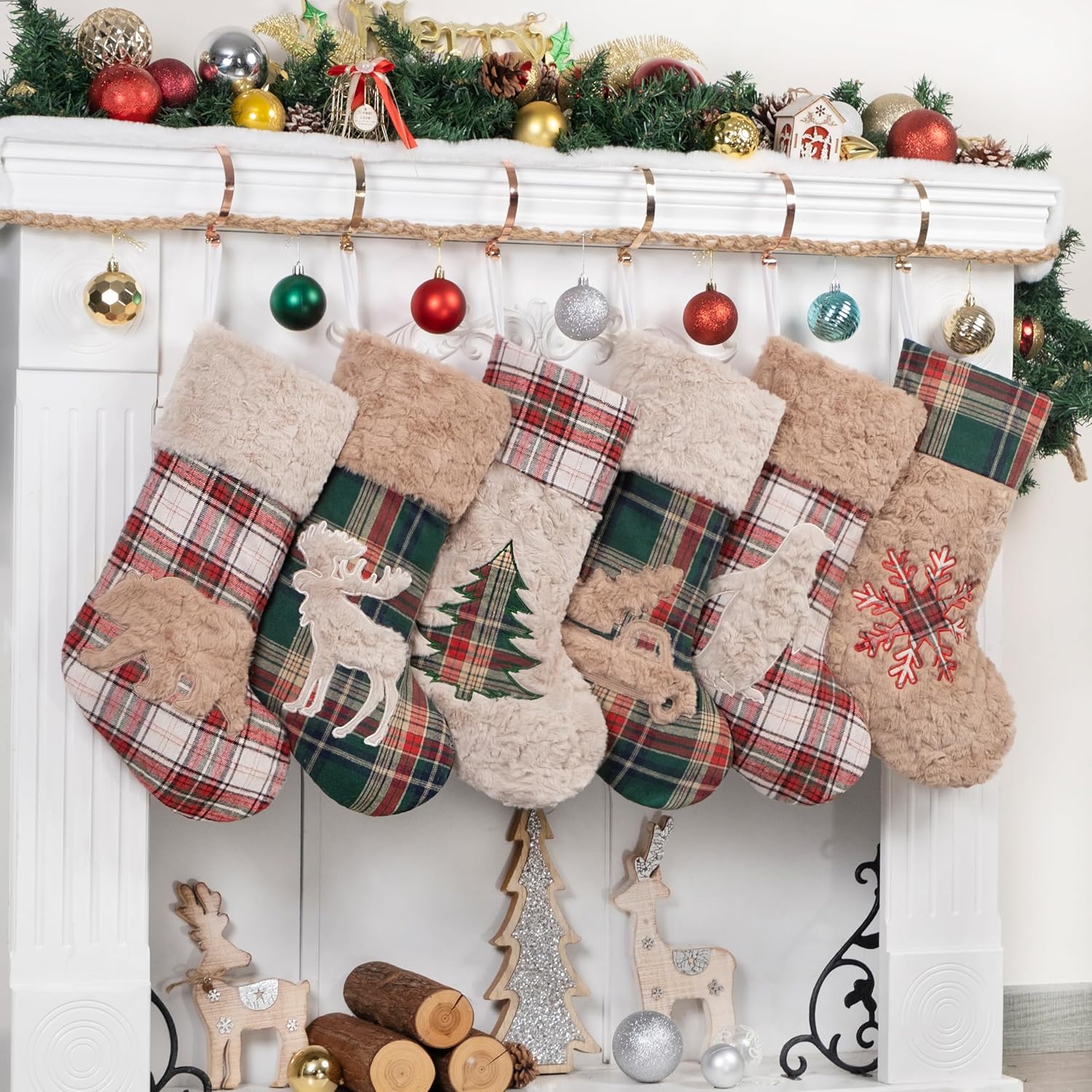 Premium Materials: Our Christmas stockings are crafted from high-quality cotton and polyester. The main body features red and green plaid fabric, complemented by brown and beige plush accents. These materials provide a soft and comfortable touch, creating a warm and lively festive atmosphere